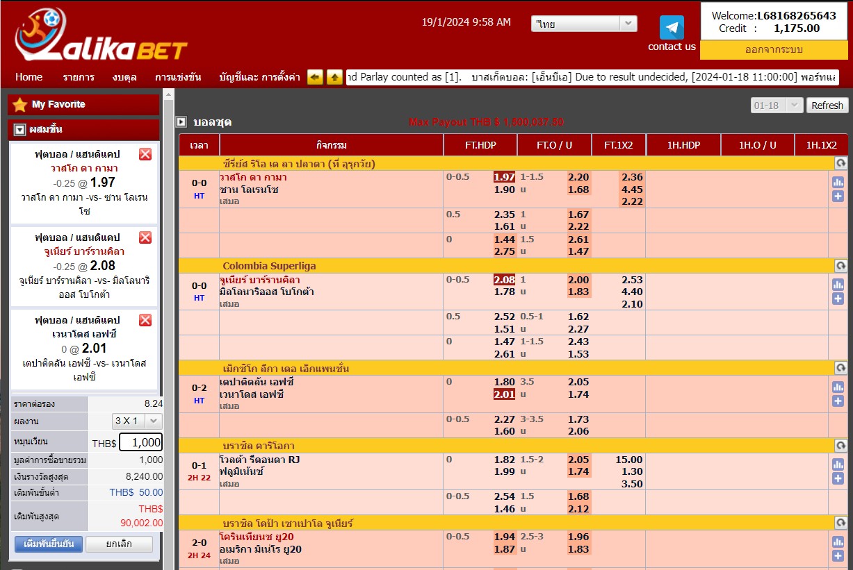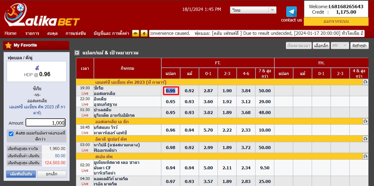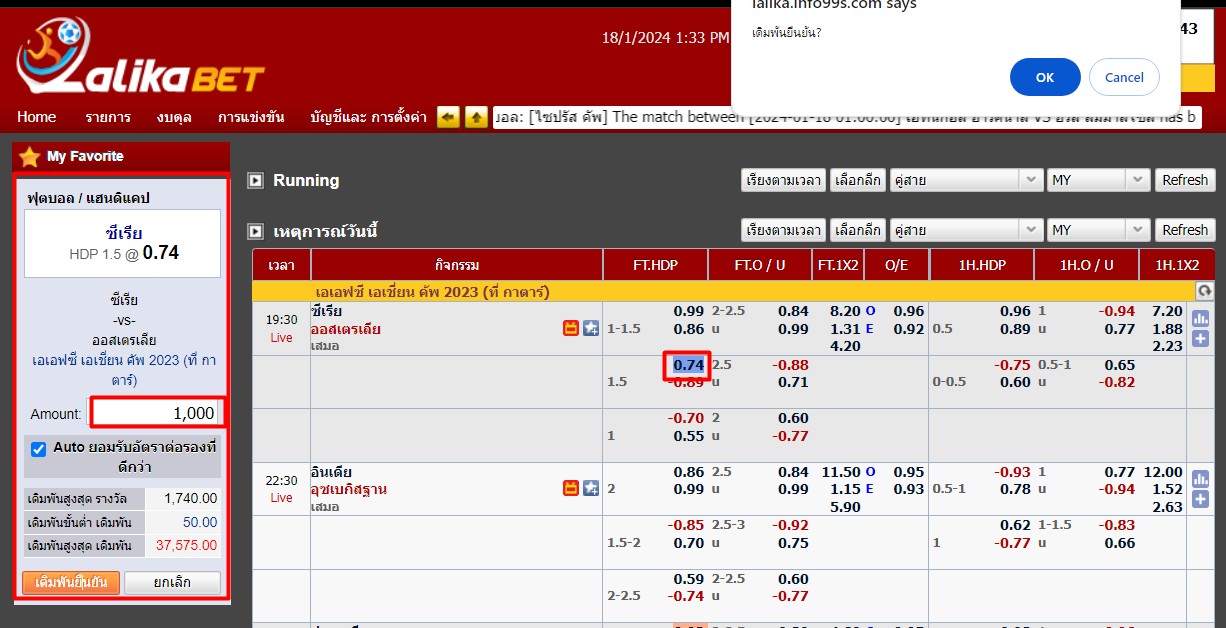 ตัวอย่างเช่น กดแทงเจ้าบ้าน ซีเรีย ราคาต่อรอง 1.5 (ลูกครึ่ง) ราคา 0.74 แล้วเลือกใส่จำนวนเงินที่เราจะแทงที่ช่องทางซ้ายมือ ใส่จำนวนเงินไป 1000 บาทถูกก็จะได้ 740 บาท ถ้ารวมกับเงินที่แทงแล้วจะได้ 1740 บาท ถ้าเสียก็เสียไป 1000 บาท แล้วกดทำรายการจะมีหน้าต่างขึ้นมา ว่า ”เดิมพันยืนยัน?” ให้กด (OK)